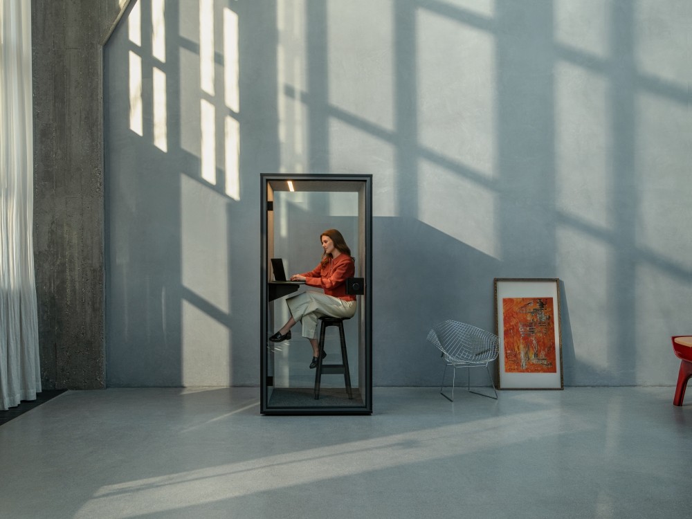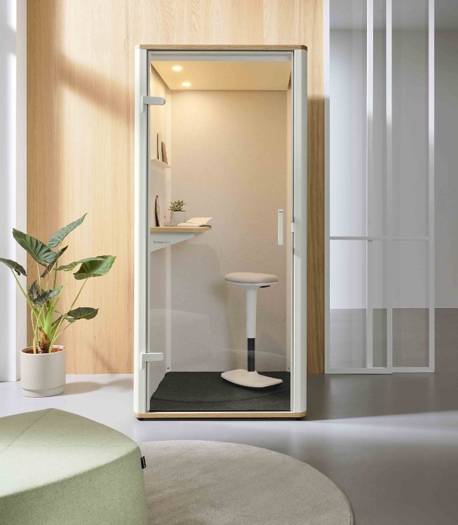 Casa Uno von Götes­sons: Mit einer Schall­däm­mung von 31,2 dB bie­tet der Mini-Cube Pri­vat­sphä­re für Video­calls und Ein­zel­ar­beit. Dank sei­ner Rol­len lässt er sich fle­xi­bel im Raum plat­zie­ren. Auto­ma­ti­sche Belüf­tung, ein fest instal­lier­ter Tisch, Steck­do­sen, USB-C-Anschlüs­se und dimm­ba­re LED-Beleuch­tung run­den die Aus­stat­tung ab. Das Design stammt vom o4i Design Studio.