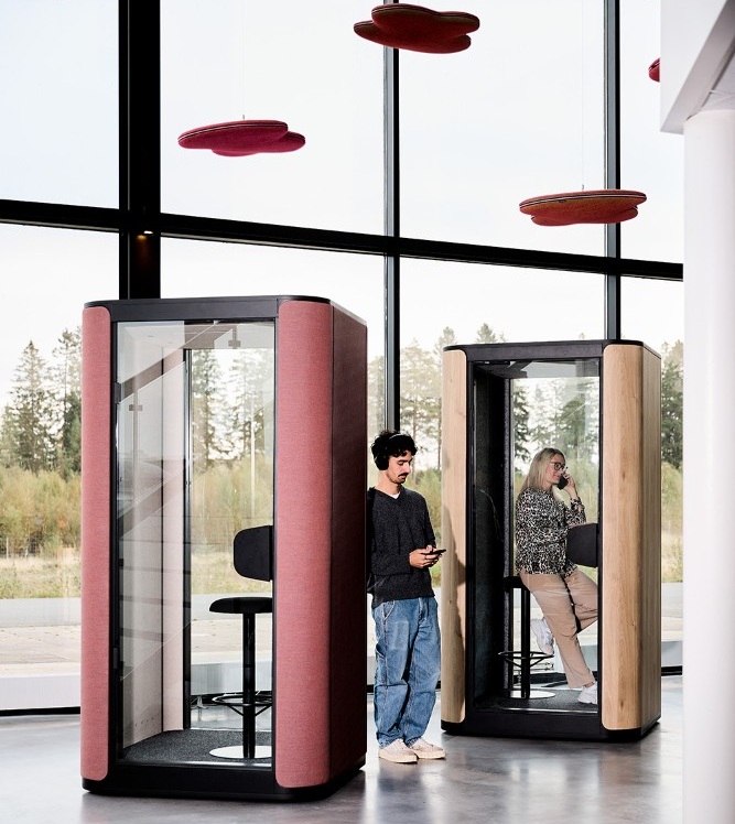 BA-Focus von Ber­lin Acou­stics: Auf einer Grund­flä­che von 1 m2 kann unge­stört (video-)telefoniert wer­den. Ein 4 cm dicker Aku­stik­filz und ein Dop­pel­bo­den mit Tep­pich­flie­sen wir­ken schall­ab­sor­bie­rend. LED-Strei­fen, die beim Betre­ten der Tele­fon­box auf­leuch­ten, und eine schall­ge­dämm­te Lüf­tungs­an­la­ge ermög­li­chen hybri­des Arbei­ten mit Komfort.